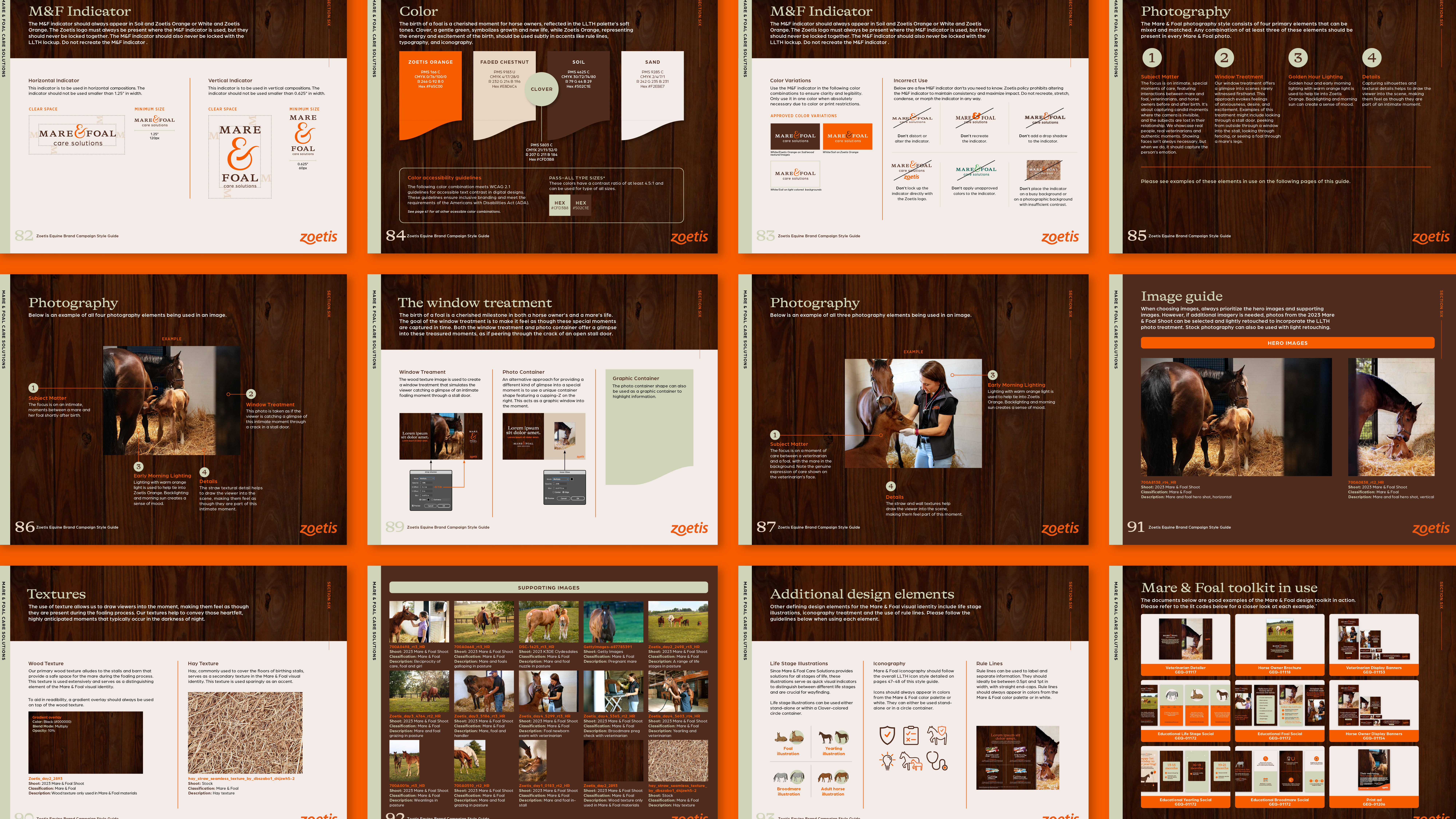 Photography plays a central role in bringing this identity to life. Each image feels like a fleeting, treasured glimpse into the barn—a peek through the stall door or fence during those quiet, intimate moments between mare and foal. Subtle texture adds depth and warmth, drawing the viewer in as though they’re sharing in the anticipation, the bond and the quiet joy of meeting a new filly for the first time. Together, this design system invites the audience to slow down, feel the moment and see Zoetis as a trusted partner through it all.