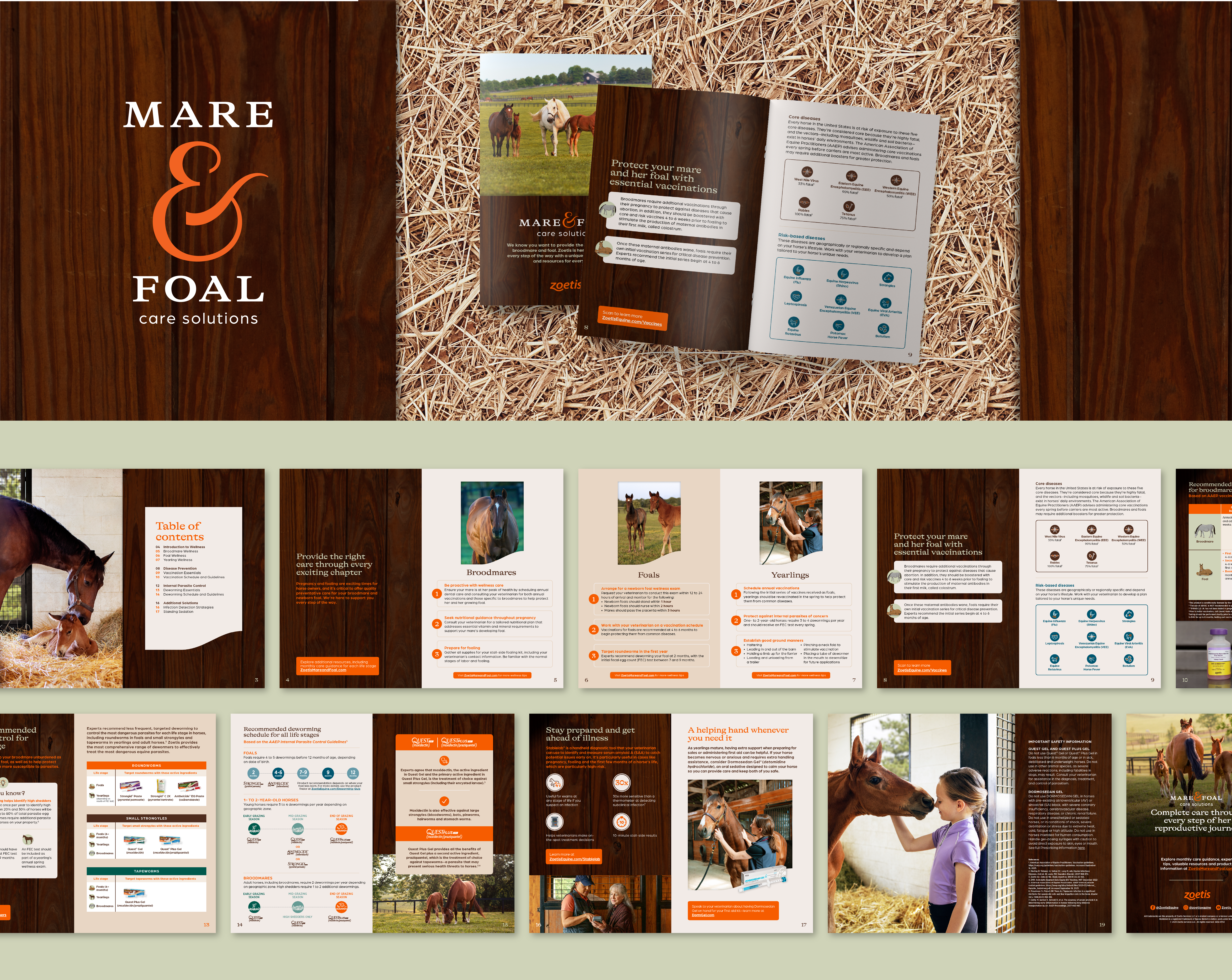 To extend the story beyond the stall, we created two supporting brochures—each tailored to a specific audience. The veterinarian-facing piece reinforces that Zoetis is by their side with trusted products for every life stage. For horse owners, the brochure focuses on education and care milestones, offering guidance and reassurance during the most formative moments of their horse’s life. Both pieces are designed to feel warm, informative and deeply personal—mirroring the emotional and visual cues of the broader identity system.